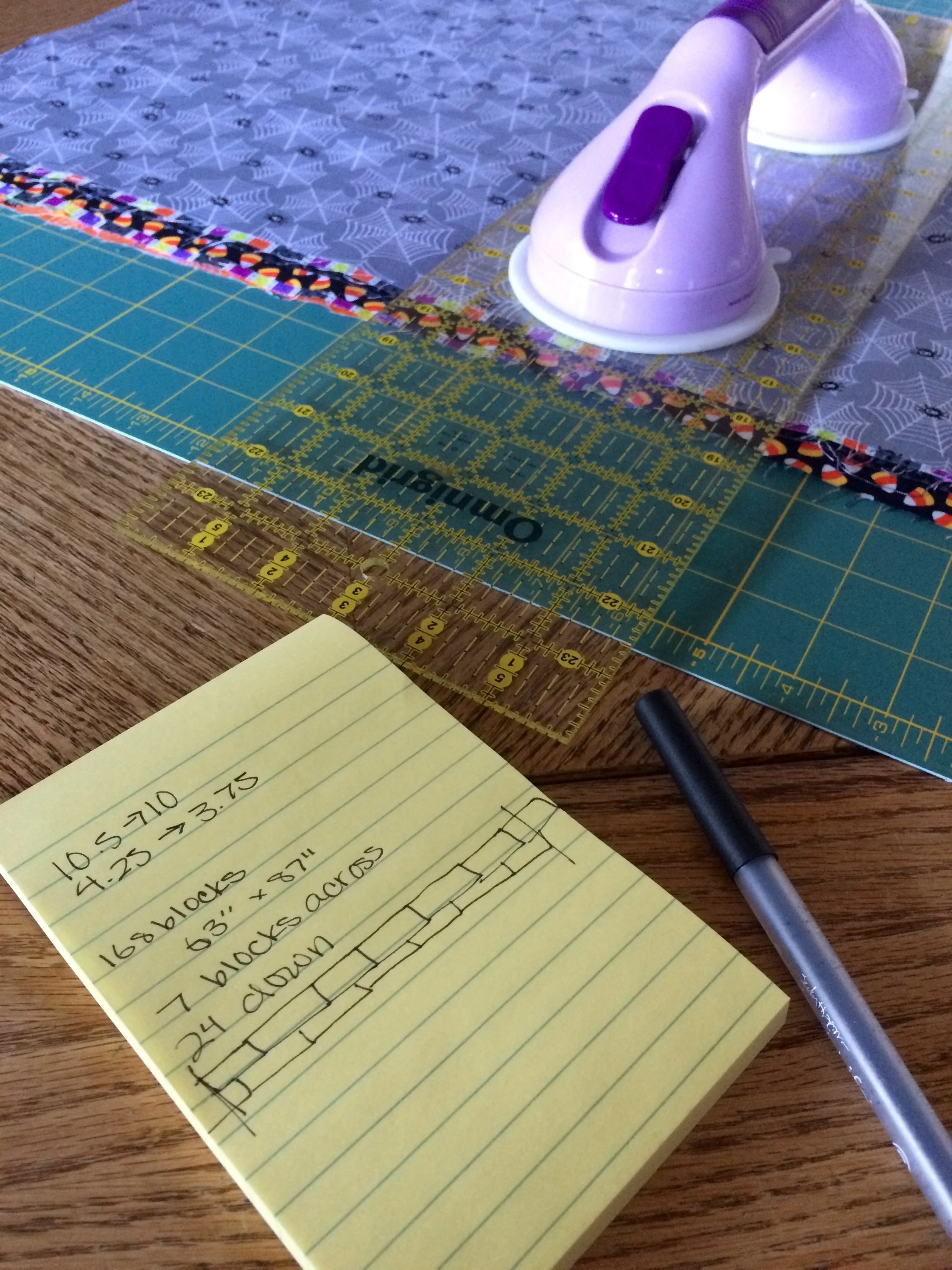 Next, I grabbed a pen and a big Post-it Note and started designing my quilt. (When I first looked back on this a year later it was total gibberish. Took some serious brain power to remember what these numbers meant. And that is why I created my Quilty Math Workbook.)